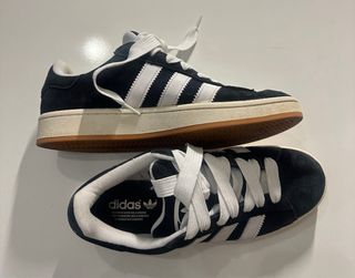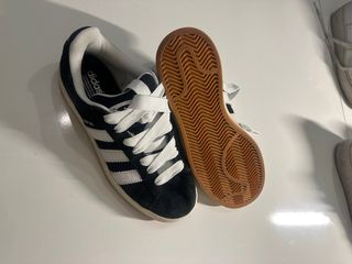 Zapatillas Adidas Campus de ante negro con detalles blancos y suela de goma. - Usadas 2 veces, están nuevas - Cierre con cordones blancos. - Tres rayas blancas laterales. - Logo de Adidas en la lengüeta y el talón.