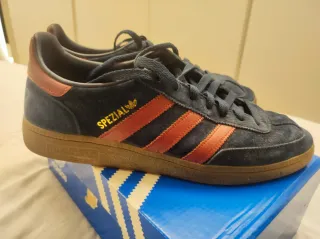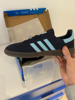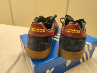 Zapatillas Adidas Spezial en color azul con detalles en rojo. - Parte superior de ante. - Tres rayas características de Adidas en rojo. - Detalle Spezial en dorado. - Suela de goma. - Logo de Adidas en dorado. Tiene unos cordones nuevos rojos.