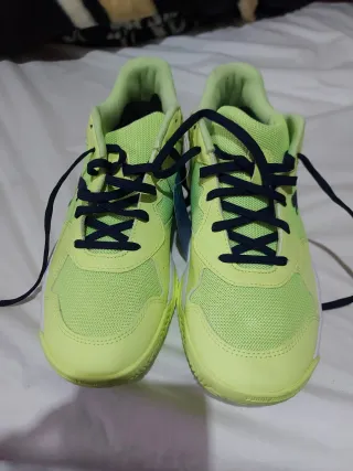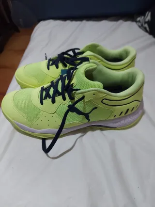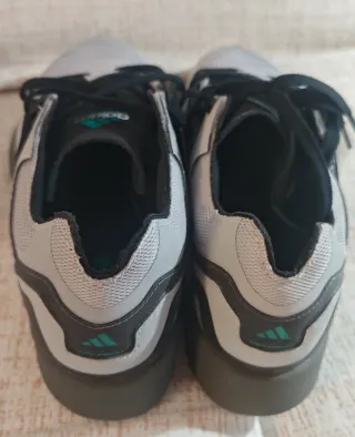 Fue un regalo que no pude cambiar, la talla es 44 pero mejor si usas 43. A mí me vienen pequeñas. Caja original. - Diseño moderno en tonos grises con detalles en verde. - Cierre de cordones para un ajuste seguro. - Suela blanca y negra. - Logo de Adidas en la lengüeta y lateral.
