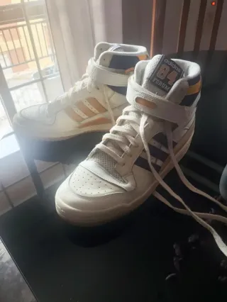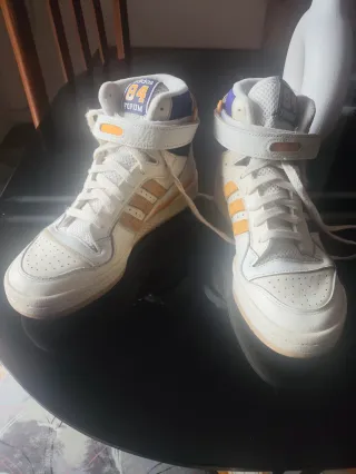 Zapatillas de caña alta Adidas Forum 84. - Diseño inspirado en los Lakers. - Combinación de colores blanco y morado. - Cierre de velcro en el tobillo.
