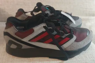 Zapatillas deportivas Adidas con un diseño moderno y llamativo. compradas en el sitio web no oficial, mi novio las usaba cuando era grande, y se vendieron a un precio bajo. - Parte superior de malla transpirable. - Detalle de tres rayas en color rojo. - Suela con amortiguación. - Combinación de blanco y gris.