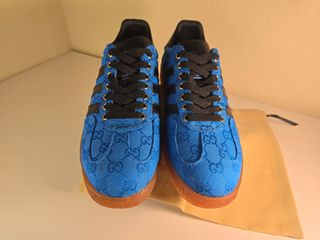 Zapatillas Adidas Gazelle en talla 43. Combinan un llamativo color azul con detalles en negro. Se ve unas marcas en la foto 3, suela tambien esta un poco jodida. - Diseño clásico Gazelle. - Suela de goma marrón. - Cordones negros.