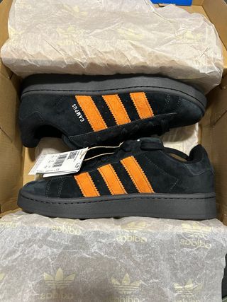 Zapatillas Adidas Campus 00’s. Unisex, talla 42 (8.5 US/8 UK/26.5cm), piel de tacto suave color negro con las tres rayas de la marca en piel naranja en sus laterales, suelas con diseño de espigas negras cocidas, cordones negros, plantillas acolchadas color negro, forro interno tioo paño negro acolchado. Nuevas, engrego en Valencia Centro, hago envios.