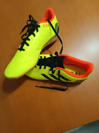 Zapatillas de fútbol Adidas Copa en color amarillo y naranja. Perfectas para jugar en interiores. Adidas talla pequeño, esto seria equivalente a una 45. Como se puede ver están totalmente nuevas, sin ningún uso. - Diseño deportivo. - Cordones negros. - Suela de goma.