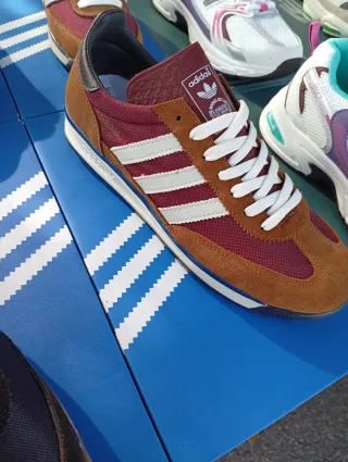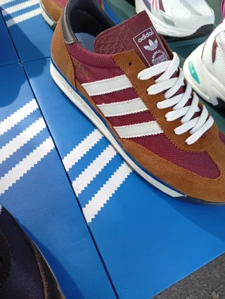 Zapatillas de estilo retro con detalles en ante y tejido. - Combinación de colores marrón y morado. - Tres rayas blancas laterales. - Logo de Adidas en la lengüeta.