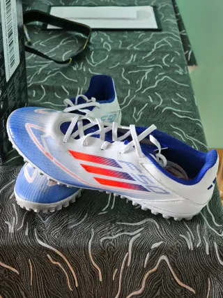 Zapatillas deportivas Adidas F50 usadas literalmente UNA VEZ. Me quedan grandes, por eso la venta. - Diseño en blanco y azul. - Detalles en naranja. - Suela con tacos para césped artificial.