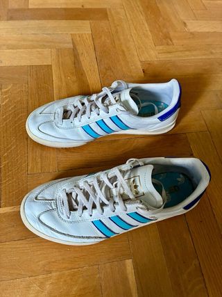 Zapatillas Adidas Handball Spezial en color azul claro y detalles en blanco y beige. Talla 41 1/3 Me las he puesto 3 dias y me confundi de talla. Estan igual que nuevas. Les entrego con otros cordones blancos que venian con las zapatillas - Parte superior de ante. - Suela de goma. - Cordones azules.