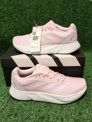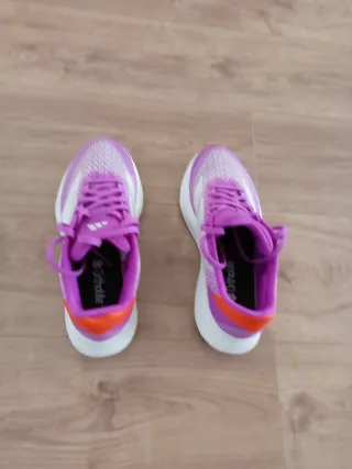 Estilo: Zapatilla deportiva diseñada para running, pero también popular como calzado casual o de estilo streetwear. Usadas 2 veces. - Diseño en color gris con detalles en rosa. - Tres rayas icónicas de Adidas en los laterales. - Logo de Adidas en el talón.