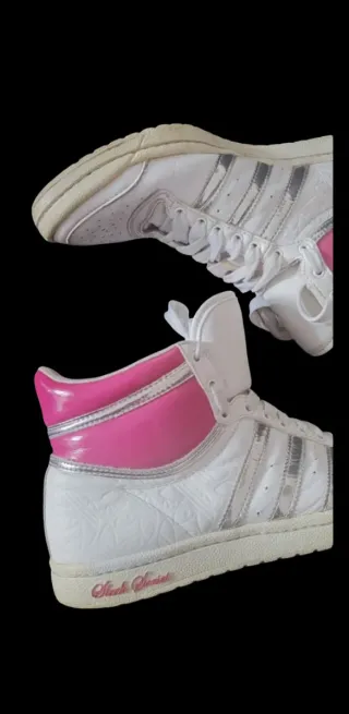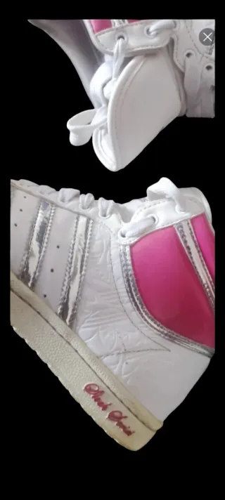 Zapatillas deportivas Adidas Sleek Series, edición limitada. - Diseño de caña alta. - Combinación de blanco y detalles en rosa brillante. - Tiras laterales plateadas. - Grabado floral en el material blanco. ¡IMPORTANTE! • Las suelas están muy duras y amarillas debido a que han estado durante mucho tiempo guardadas así que se pueden romper, el resto de la zapatilla está súper bien conservada, solo sirven para coleccionar o reparar!!