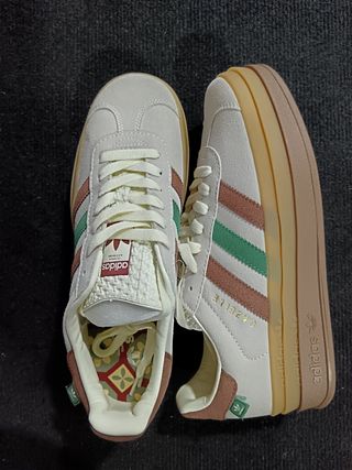 Zapatillas Adidas Gazelle en color beige y rosa. talla 40,5 Un clásico reinventado con un toque moderno. - Diseño icónico de las Gazelle. - Materiales de calidad para mayor comodidad. - Cordones a juego para un look coordinado. Un solo uso.