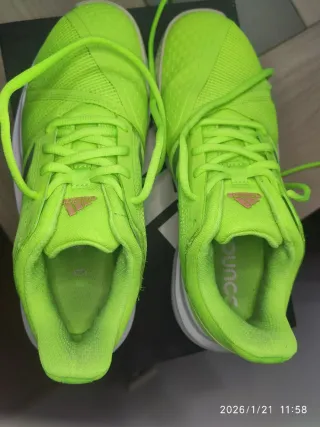 Zapatillas deportivas Adidas Courtjam Bounce W en llamativo color verde flúor. Diseñadas para ofrecer comodidad y rendimiento pádel o tenis. - Parte superior de malla transpirable. - Tecnología Bounce para amortiguación. - Suela de goma para mayor tracción.