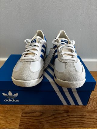 Zapatillas Adidas SL 72 RS T en talla 39 1/3. Un clásico renovado con un diseño deportivo y materiales de calidad. NUEVAS CON CAJA Y ETIQUETA ORIGINALES - Combinación de blanco y azul. - Detalle de las icónicas tres rayas de Adidas.