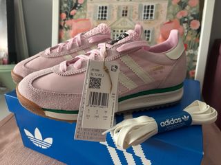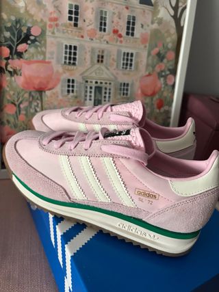 Zapatillas deportivas Adidas SL 72 en color rosa. - Diseño clásico de Adidas. - Detalles en blanco y verde. - Suela de goma. Talla 38. Nuevas, con etiqueta, caja y cordones blancos de repuesto.