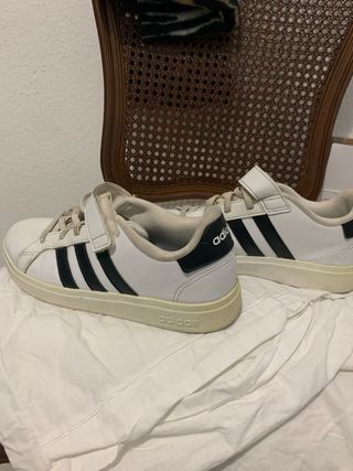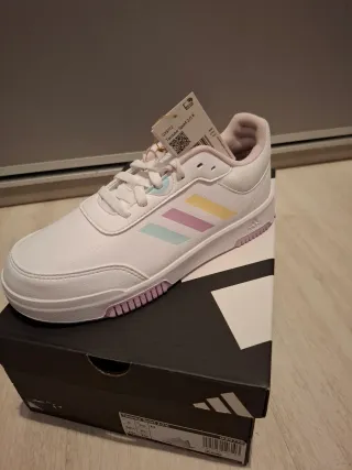 Zapatillas Adidas Team Court en talla 38 2/3. Diseño clásico y versátil. - Parte superior de cuero sintético. - Cierre de cordones. - Suela de goma. - Detalle de las tres bandas.