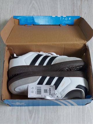 Zapatillas Adidas Samba en talla 38, con un diseño clásico y deportivo. - Color principal blanco con detalles en negro. - Cierre con cordones. - Suela de goma. - Incluye caja original.