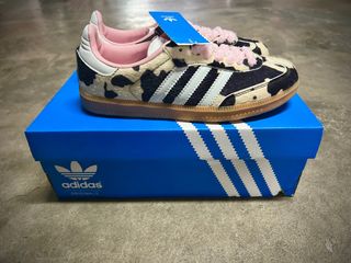 Zapatillas Adidas Samba con un diseño único de vaca. - Parte superior con pelo sintético. - Detalles en negro y blanco. - Suela de goma. - Cordones marrones.