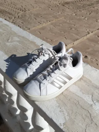 Zapatillas deportivas Adidas en color blanco y detalles plateados. - Diseño clásico con tres rayas. - Cierre de cordones.