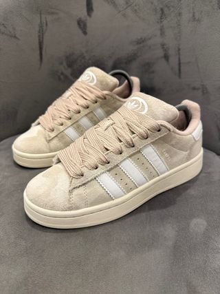 Zapatillas Adidas Campus en color beige y blanco. Un clásico atemporal. - Diseño de ante. - Tres rayas laterales. - Detalle de logo en la lengüeta.