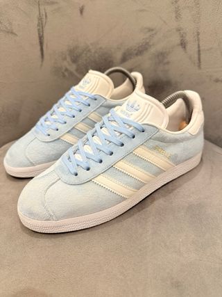 Zapatillas Adidas Gazelle en tonos azules y blancos. Sin plantillas Interiores - Diseño clásico. - Detalles de las tres rayas. - Logo de Adidas en la lengüeta.