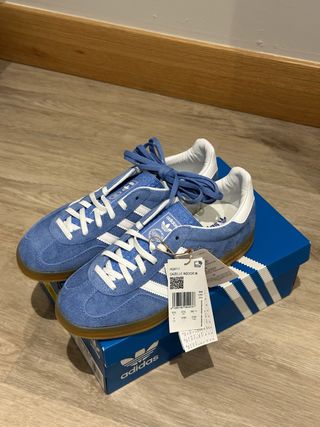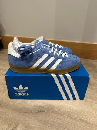 Zapatillas Adidas Gazelle en color azul y blanco. Un clásico con suela de goma. - Parte superior de ante. - Detalle de las tres rayas blancas. - Cierre con cordones blancos o azules . - Tallan grande, corresponde a un 38 en otras marcas.