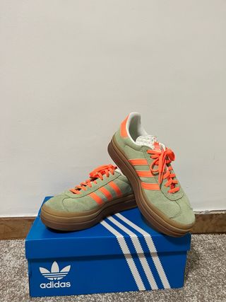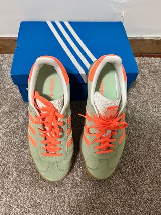 Vendo Adidas Gazelle originales, compradas en Snipes este verano. Solo me las he puesto un par de veces, están en muy buen estado, sin apenas uso. No las vendo por ningún defecto, simplemente no son mi estilo. Color verde con detalles en naranja y suela marrón, muy llamativas. Incluyo caja original de Adidas. Cualquier cosa me escribís