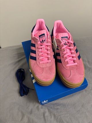 Zapatillas Adidas Gazelle Bold W en color rosa. - Diseño con plataforma. - Detalles en azul marino. - Suela de goma marrón. - Caja original y cordones de repuesto.
