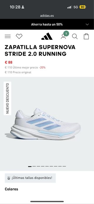 Zapatilla de running Adidas Supernova Stride 2.0. - Diseño en blanco y azul. - Ideal para corredores. - Usadas solo una vez, no me valen y se me pasó el tiempo de devolución.