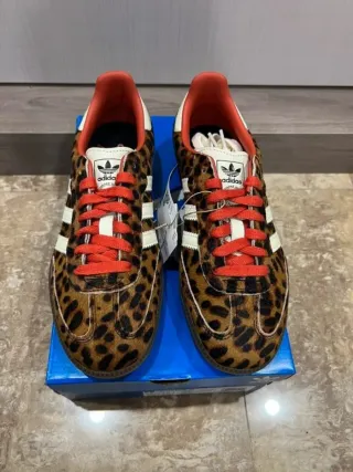 Zapatillas Adidas Samba con un llamativo estampado de leopardo. - Diseño icónico de Adidas. - Detalles en blanco y rojo. - Suela de goma. - Cordones rojos.