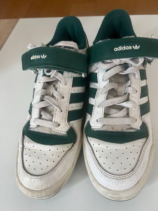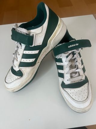 Zapatillas deportivas Adidas Forum Low en color verde y blanco. - Diseño clásico de caña baja. - Cierre con cordones y correa de velcro. - Detalle de las tres rayas icónicas de Adidas.