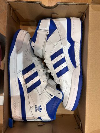 Zapatillas de caña media Adidas Forum Mid. - Diseño clásico con detalles en azul y blanco. - Cierre de velcro en la parte superior.