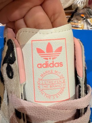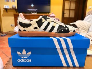 Zapatillas Adidas Samba con un llamativo diseño de estampado de vaca. - Parte superior con pelo sintético y detalles en blanco. - Suela de goma marrón. - Cordones rosas. - Detalle de talón en rosa.