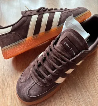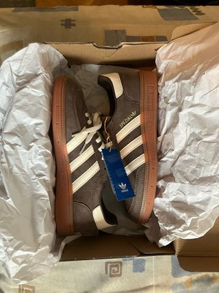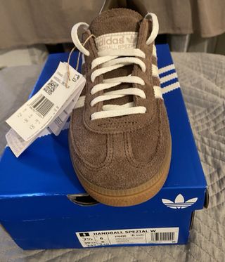 Zapatillas NUEVAS Adidas Handball Spezial en color marrón y beige. Precio en web de Adidas: 110 € Vendo porque fue un regalo y no son mi talla. Caracteristicas: - Diseño clásico. - Suela de goma. - Detalle de las tres rayas icónicas de Adidas.