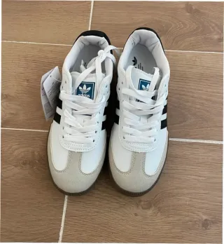 Zapatillas Adidas Samba en talla 37 EU. - Diseño clásico con las tres rayas. - Combinación de cuero blanco y ante gris. - Suela de goma marrón. - Detalle de SAMBA en el lateral.