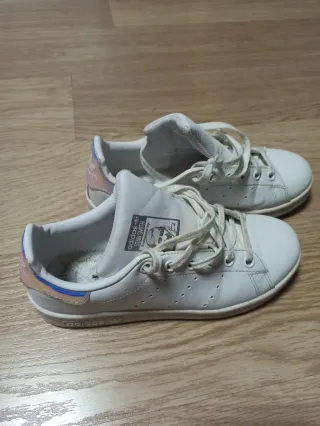 Zapatillas deportivas Adidas Stan Smith en color blanco. Diseño clásico y versátil. Muy poco uso. - Detalle iridiscente en el talón. - Cierre de cordones. - Logo de Stan Smith en la lengüeta.