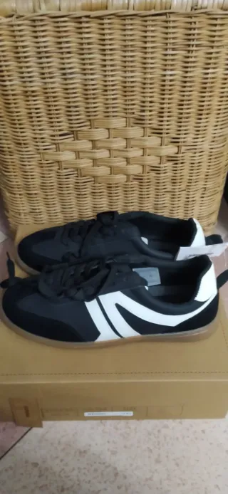 Zapatillas deportivas con un diseño moderno y llamativo. - Combinación de colores negro y blanco. - Suela de goma. - Cierre con cordones.. Estilo parecido a las(Adidas)