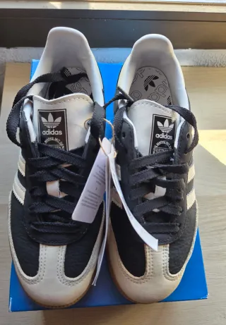 Zapatillas Adidas Samba clásicas, perfectas para el día a día. - Diseño atemporal en blanco y negro. - Suela de goma. - Detalle de las tres rayas icónicas de Adidas.
