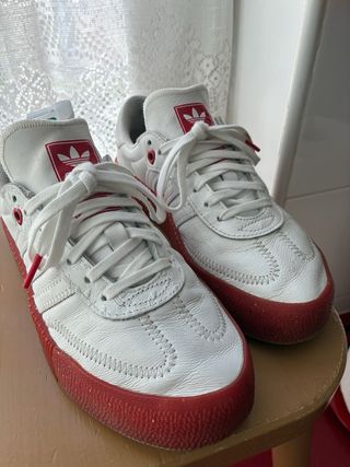 Zapatillas Adidas Samba de edición limitada. - Diseño en blanco con detalles en rojo. - Suela de goma roja. - Cierre con cordones blancos.