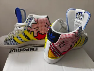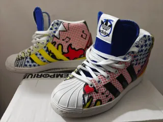 Zapatillas de edición limitada de Adidas x Rita Ora con un vibrante diseño Pop-Art. - Estampado multicolor con estrellas y elementos gráficos. - Diseño de caña alta. - Cordones blancos. -Tacon pronunciado(sube mucha altura) Difíciles de encontrar en tienda hoy en día. Están prácticamente nuevas.
