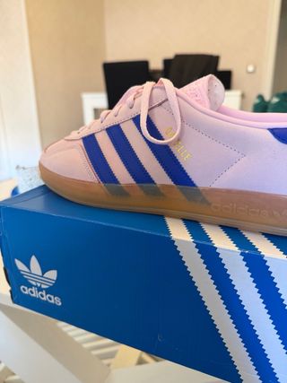 Zapatillas Adidas Gazelle Indoor W en color rosa con detalles azules. - Modelo: Gazelle Indoor W - Talla: 43 1/3 (EU) / 9 (UK) / 275 (CM) - Color: Rosa / Azul - Suela de goma - Fabricadas en Indonesia Están como nuevas, con solo un uso