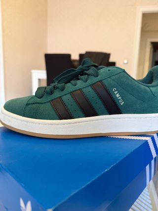 Zapatillas Adidas Campus 00s en color verde y negro. - Parte superior de ante. - Detalle de las tres rayas en negro. - Etiqueta CAMPUS en el lateral. Están como nuevas con un solo uso