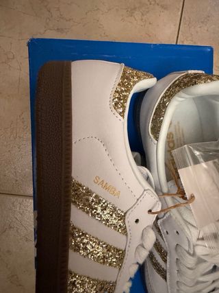 Zapatillas Adidas Samba OG con un toque brillante y elegante. - Diseño con detalles de purpurina dorada. - Combinación de blanco y detalles dorados. - Suela de goma marrón.