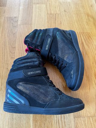 Zapatillas altas de la colección Adidas Neo x Selena Gomez. - Diseño en color negro con detalles brillantes e interior rosa. - Cierre de velcro y cordones. - Con cuña.