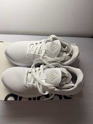 Zapatillas deportivas Adidas en color blanco y plateado, completamente nuevas y con etiquetas. - Diseño moderno y ligero. - Detalles de las tres rayas icónicas de Adidas. Talla 38/2 dice