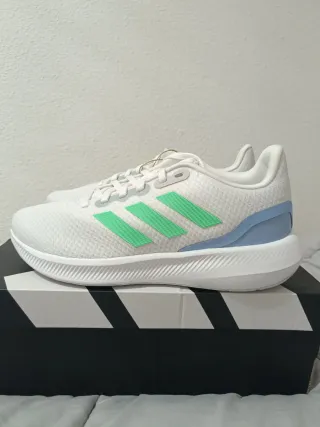 Zapatillas deportivas Adidas Runfalcon 3.0. - Diseño moderno en blanco con detalles en verde y azul. - Parte superior de malla transpirable. - Suela de goma para mayor agarre.