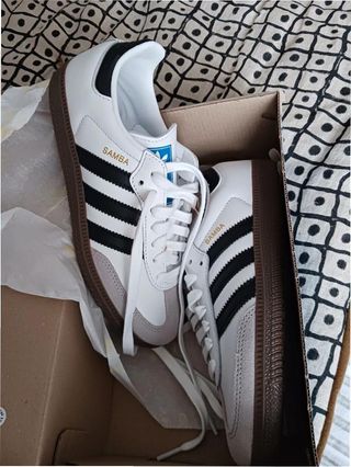 Zapatillas Adidas Samba OG en talla 36. - Diseño clásico con detalles en gamuza. - Tres franjas icónicas de Adidas en los laterales. - Suela de goma marrón. - Cierre con cordones blancos.