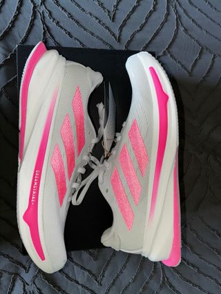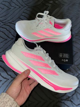 Zapatillas deportivas Adidas Supernova Rise 2 en color blanco y rosa. Talla 40 EU / US 8 W - Diseño moderno con detalles en rosa vibrante. - Suela con tecnología Dreamstrike+. - Cierre de cordones. - Logo de Adidas en los laterales y la lengüeta.