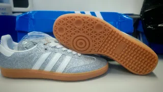 Zapatillas Adidas Samba con un diseño brillante y llamativo. - Acabado plateado con detalles blancos. - Suela de goma marrón. - Cordones blancos y grises Calidad 10/10