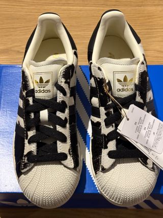 Zapatillas Adidas Superstar con un llamativo diseño de estampado de vaca. - Combinación de colores blanco y negro. - Detalle de las icónicas tres rayas.