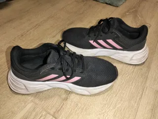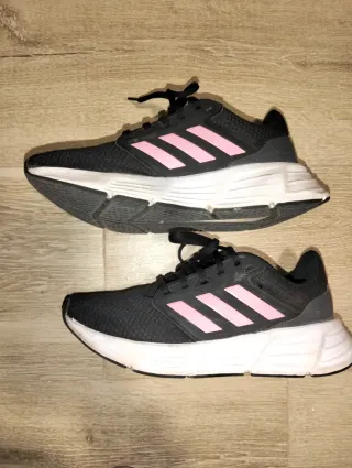Zapatillas deportivas Adidas Galaxy 6 en color negro con detalles en rosa. Muy bien estado, mi hija apenas las ha usado porque le creció el pie. - Diseño moderno y ligero. - Suela blanca con amortiguación. - Cierre con cordones.