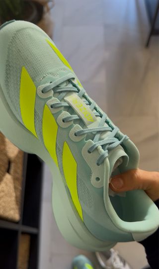 Zapatillas deportivas Adidas Adizero en color verde azulado y detalles en amarillo. Ideales para correr. En su caja, con etiqueta. Las vendo porque me quedan pequeñas. Precio actual: 130€